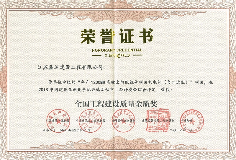 會(huì)上,對(duì)建設(shè)行業(yè)做出杰出貢獻(xiàn)的優(yōu)秀企業(yè)和個(gè)人進(jìn)行表彰。經(jīng)組委會(huì)評(píng)審,我司被授予“全國(guó)優(yōu)秀施工企業(yè)”榮譽(yù)稱號(hào),我司申報(bào)的“年產(chǎn)1200MW高效太陽(yáng)能組件項(xiàng)目機(jī)電包(含二次配)”榮獲“全國(guó)工程建設(shè)質(zhì)量金質(zhì)獎(jiǎng)”榮譽(yù)稱號(hào)。